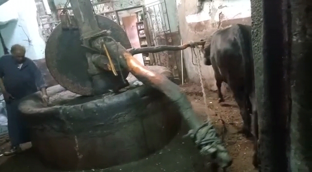 أما عن مراحل تصنيع واستخلاص الزيوت فيتحدث الحاج يونس، أنها تتم على مرحلتين فقط، هما: الأولى وهى هرس وطحن البذور داخل حجر جرايتنى ضخم تقوم بتحريكه "بقرة" يتم ربطها بعرق مشى.