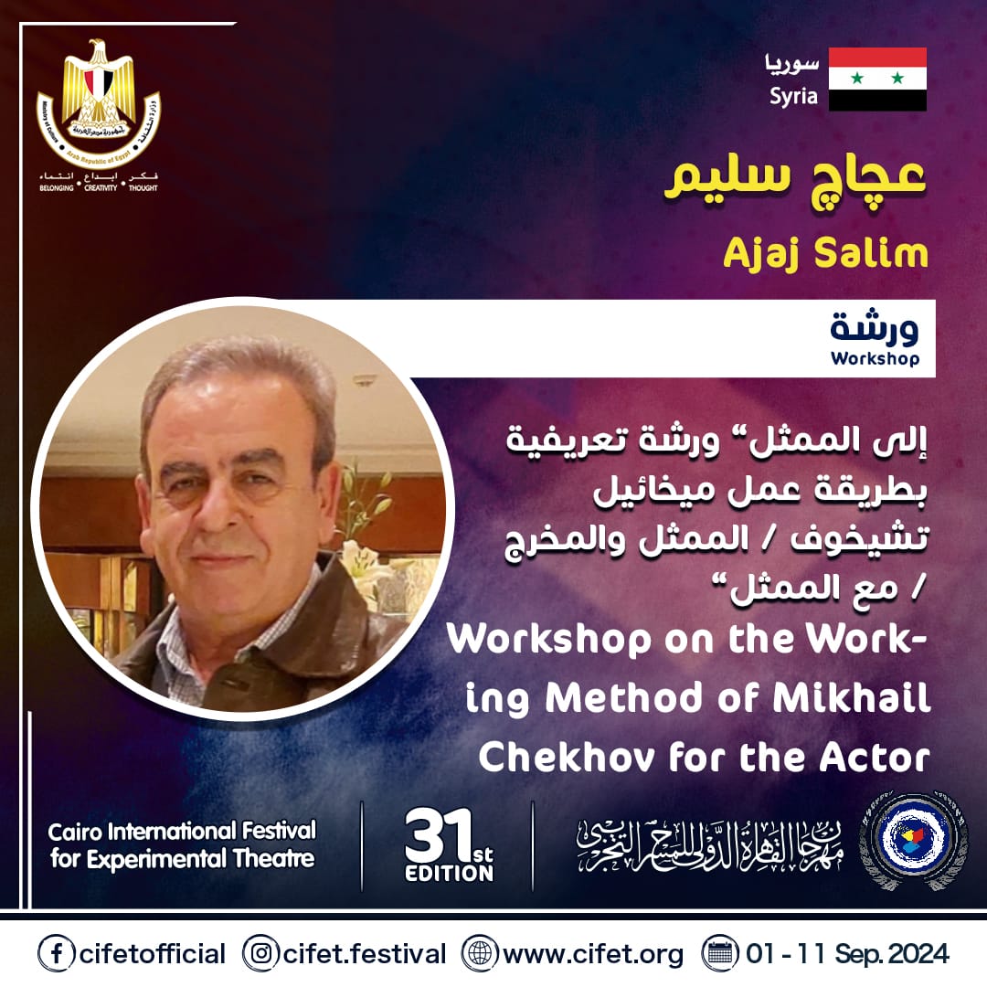 أعلنت إدارة مهرجان القاهرة الدولي للمسرح التجريبي، في دورته الحادية والثلاثين، برئاسة الدكتور سامح مهران، والمقرر إقامتها خلال الفترة من 1 إلى 11 سبتمبر المقبل عن تقديم ورشة جديدة من ضمن (9) ورش فنية يقدمها المهرجان خلال دورة هذا العام، حيث يقدم الدكتور عجاج سليم ورشة بعنوان "إلى الممثل" وهي ورشة تعريفية بطريقة عمل ميخائيل تشيخوف، كما ينظم المهرجان "ماستر كلاس" بعنوان "نقاش مع الراقص ومصمم الرقصات فرناندو ميلو".