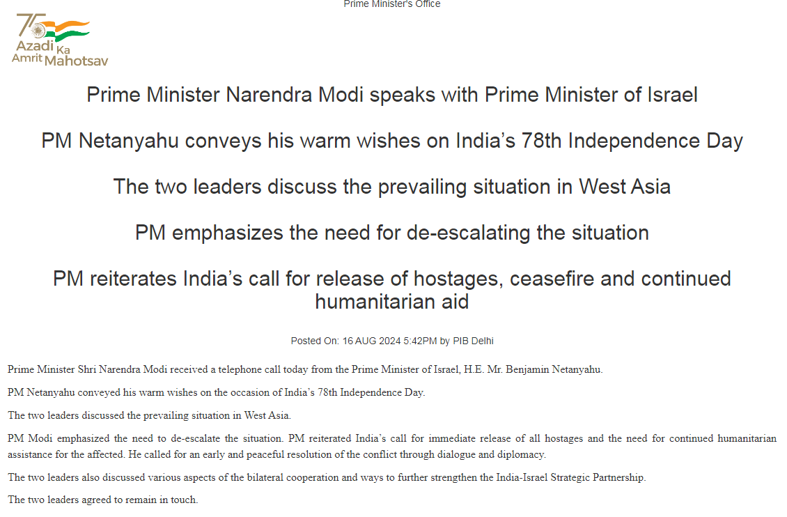وقالت رئاسة وزراء الهند في بيان لها أن رئيس الوزراء الهندي تلقي مكالمة هاتفية من نظيره نتنياهو بمناسبة عيد استقلال الهند الثامن والسبعين.