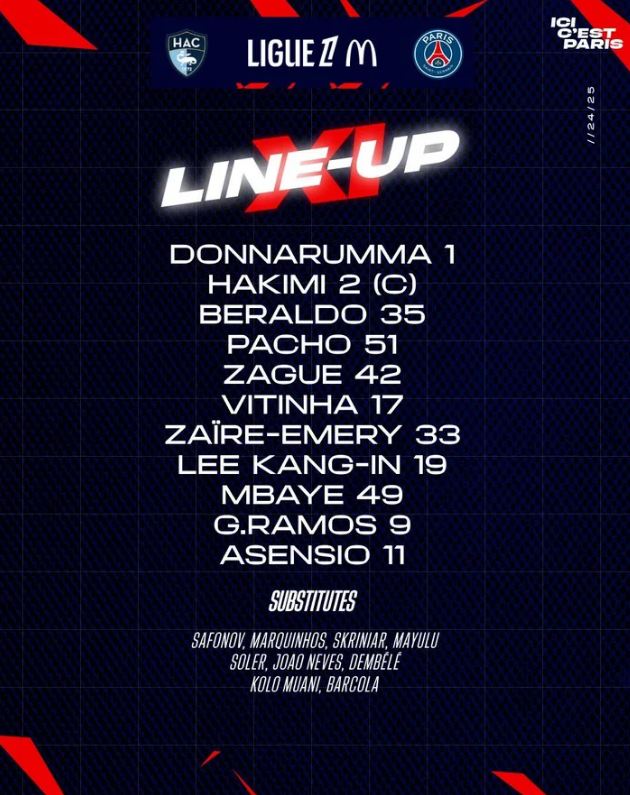 دوناروما، أشرف حكيمي، ماركينيوس، جونزالو راموس، عثمان ديمبلي، أسينسيو، فيتينيا، لي كانج إن، كولو مواني، مايولو، سولير، باركولا، زاير إيمري، بيرالدو، سكرينيار، سافونوف، زاجي، مباي، باتشو، تيناس، جواو نيفيز