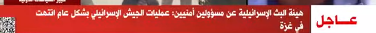 قالت هيئة البث الإسرائيلية، نقلًا عن مسئولين أمنيين، إن عمليات الجيش الإسرائيلي بشكل عام انتهت في غزة، وفقًا لما أفادت قناة “القاهرة الإخبارية”، في نبأ عاجل لها.