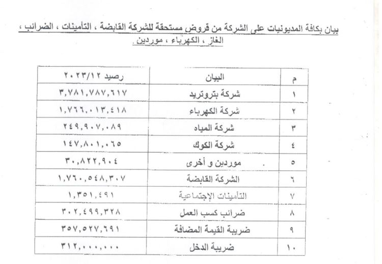 فيما سجلت الديون المستحقة للتأمينات الاجتماعية نحو 1.35 مليون جنيه، وبلغت ديون ضرائب كسب العمل نحو 302.49 مليون جنيه، وضريبة القيمة المضافة نحو 357.52 مليون جنيه، وضريبة الدخل نحو 312 مليون جنيه.