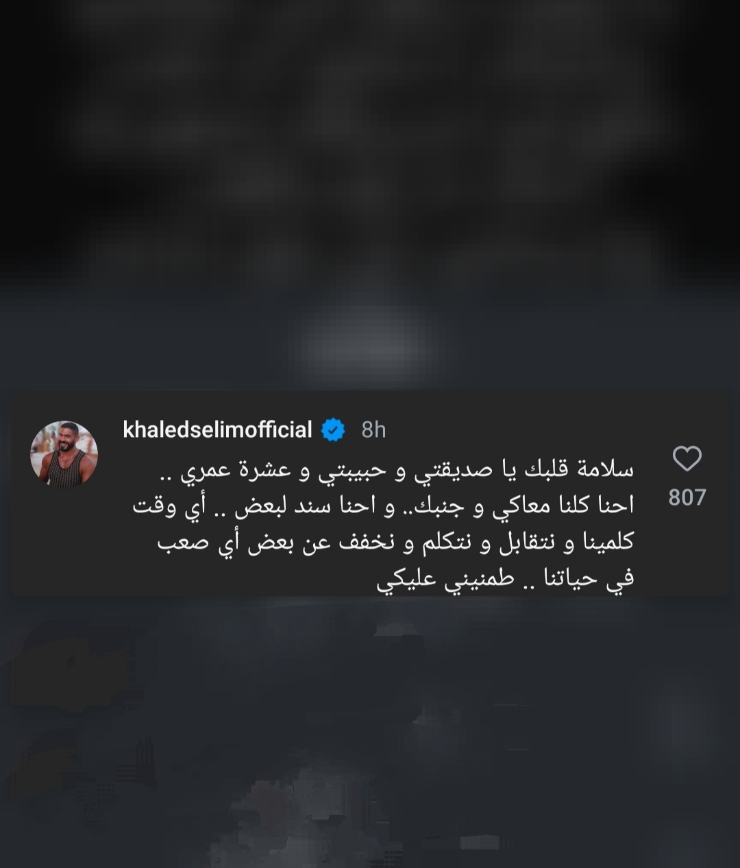 علق خالد سليم، قائلاً: "سلامة قلبك يا صديقتي وحبيبتي وعشرة عمري .. احنا كلنا معاكي وجنبك.. واحنا سند لبعض .. أي وقت كلمينا ونتقابل ونتكلم ونخفف عن بعض أي صعب في حياتنا.. طمنيني عليكي".