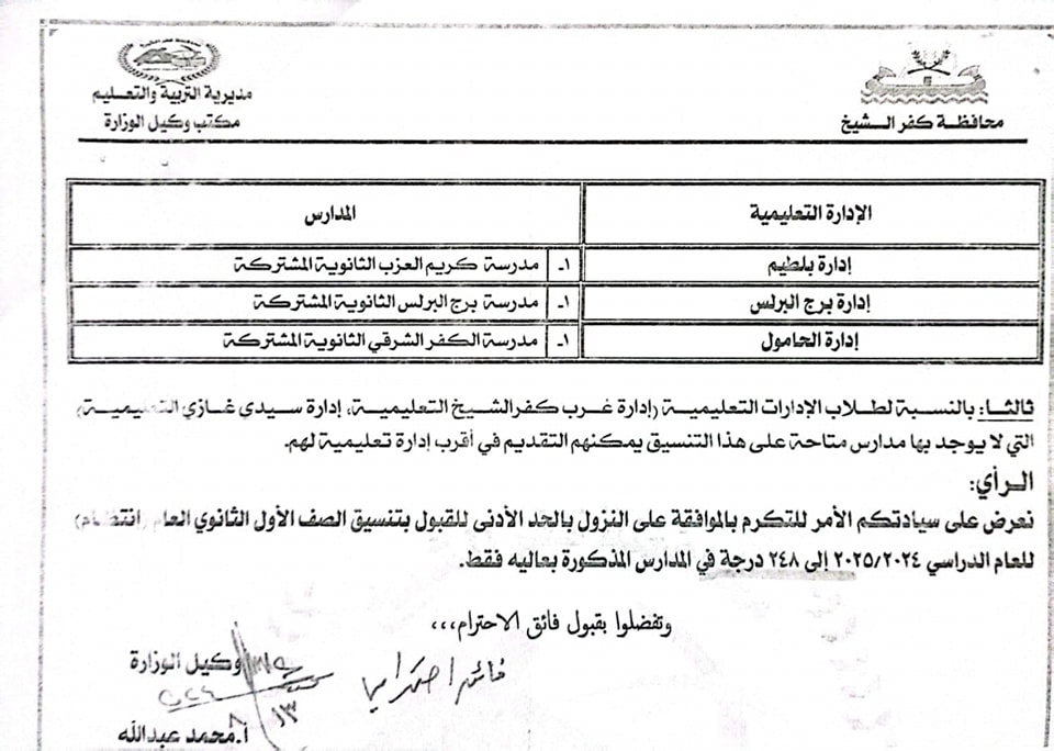 وافق محافظ كفر الشيخ اللواء دكتور علاء عبد المعطي، على خفض تنسيق القبول في بعض مدارس الإدارات التعليمية بمدارس التعليم الثانوي العام إلى (248 درجة بدلًا من 254 درجة) (انتظام) للعام الدراسي 2024/2025م، وقد تلقى محافظ كفر الشيخ العديد من الطلبات من أولياء الأمور والطلاب، للنزول بتنسيق القبول بالثانوية العامة.