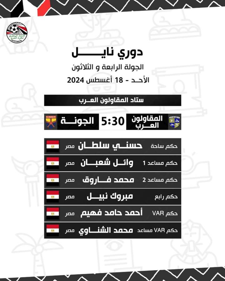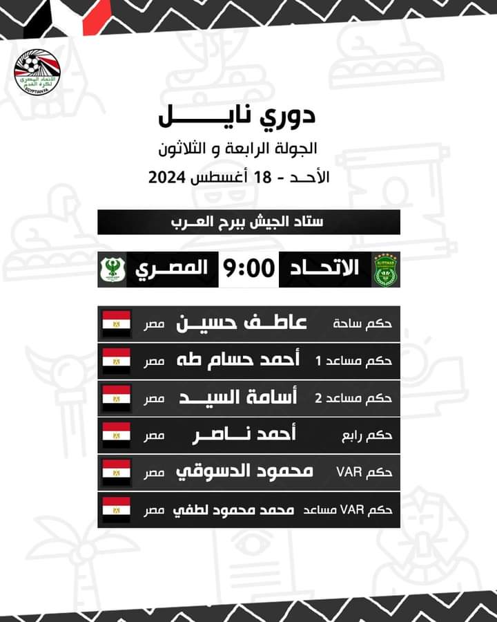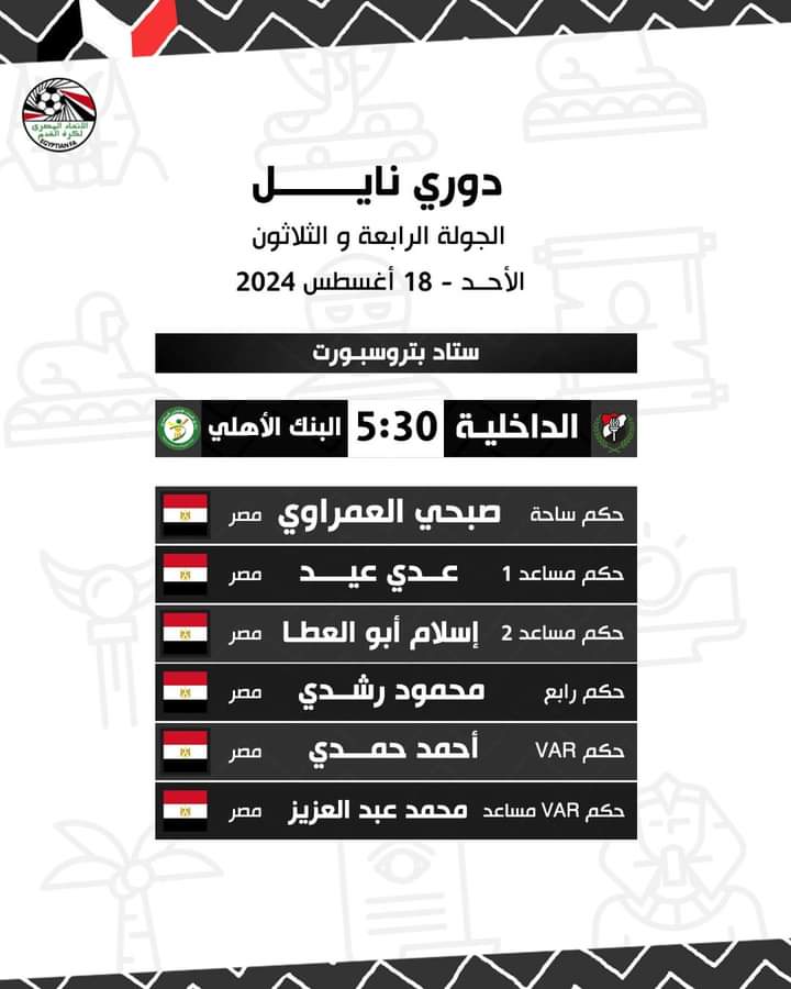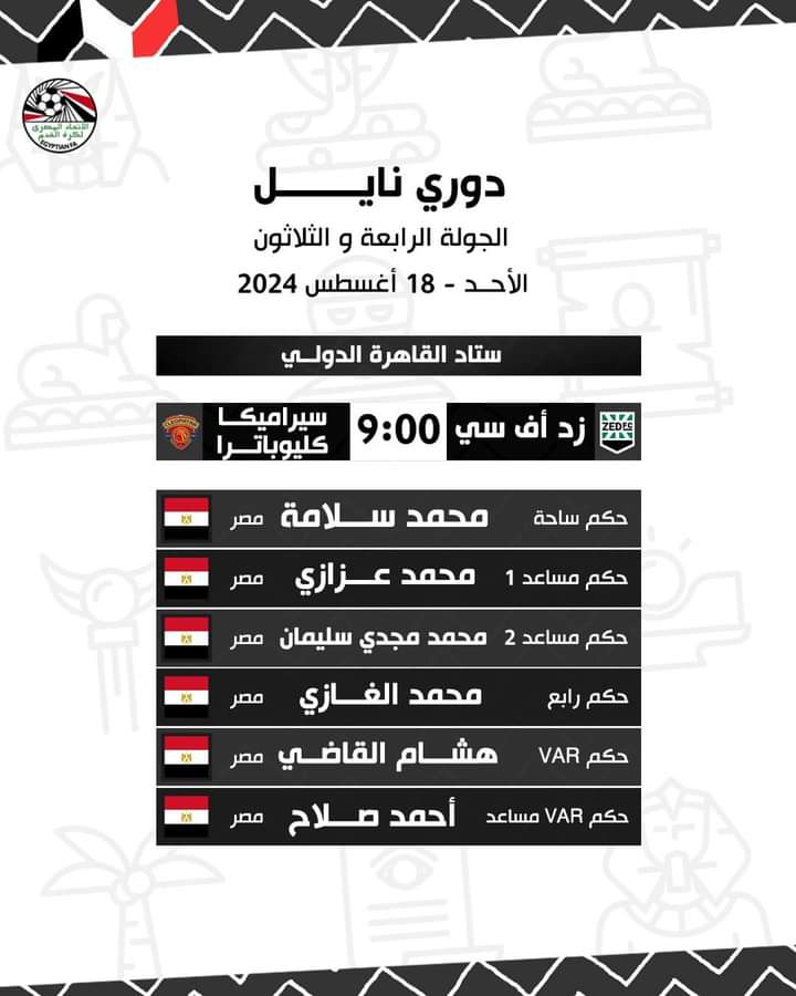 أعلنت لجنة الحكام الرئيسية باتحاد الكرة، حكام مباريات الأحد في الجولة الأخيرة وختام مباريات الدوري المصري الممتاز.