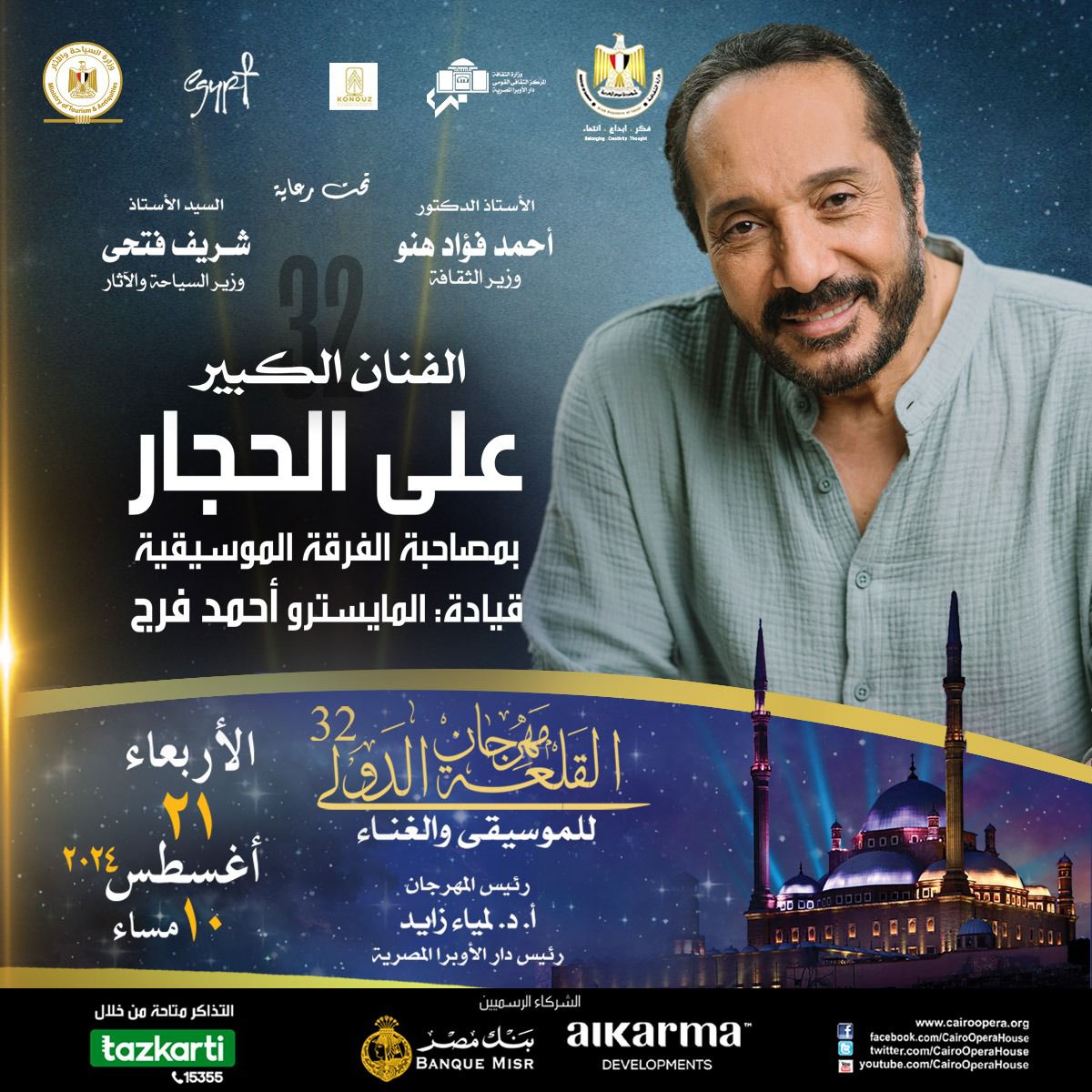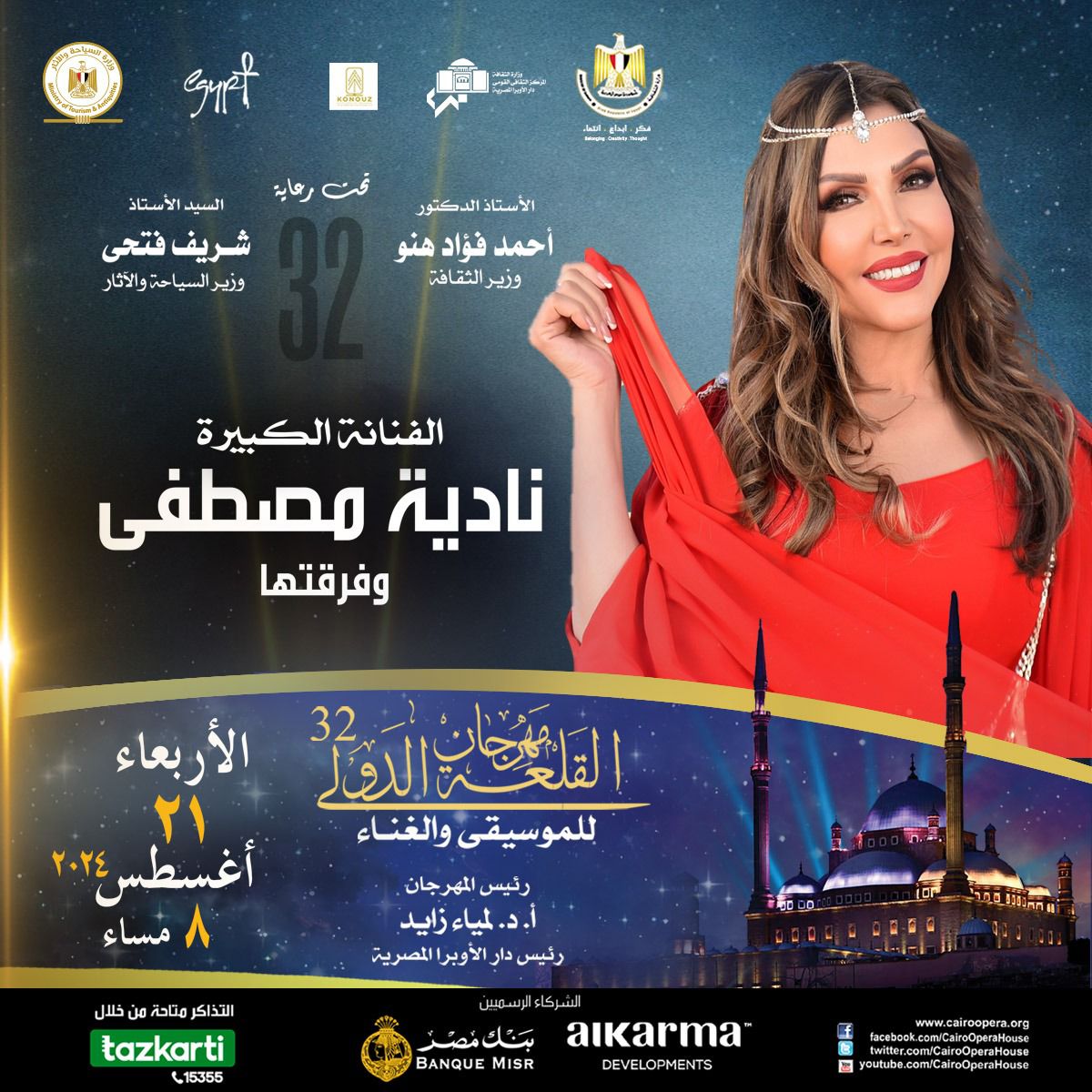 تحت رعاية الدكتور أحمد فؤاد هنو، وزير الثقافة، تتواصل فعاليات مهرجان القلعه الدولى للموسيقى والغناء في دورته الـ٣٢ الذى تنظمه دار الأوبرا المصرية، برئاسة الدكتورة لمياء زايد، حيث يقام حفلان للنجم علي الحجار والنجمة نادية مصطفى مساء الأربعاء ٢١ أغسطس على مسرح المحكى.