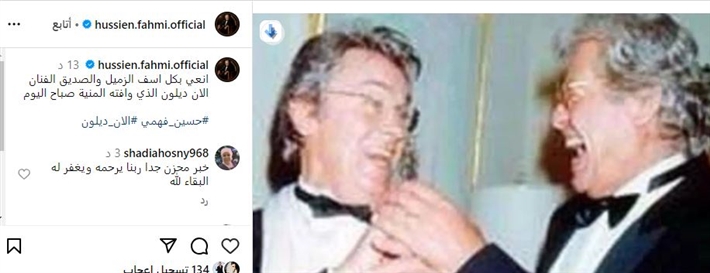 وعلق فهمي على الصورة قائلًا:"انعي بكل أسف الزميل الصديق آلان ديلون الذي وفاته المنية صباح اليوم".