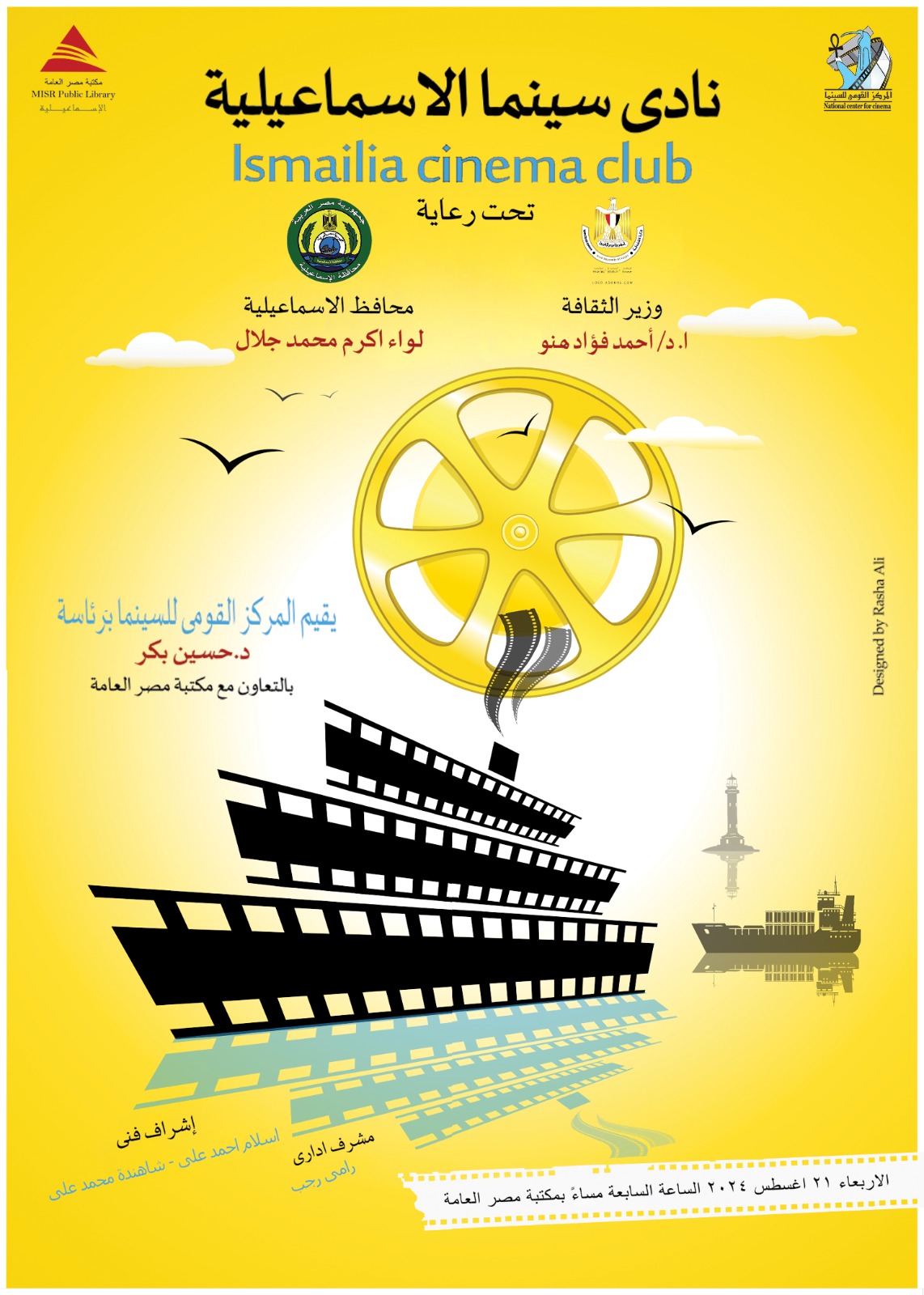 يقيم المركز القومي للسينما برئاسة مدير التصوير د.حسين بكر فعاليات نادي سينما الإسماعيلية بالتعاون مع مكتبة مصر العامة ، وذلك يوم الأربعاء المقبل الموافق ٢١ اغسطس في تمام الساعة ٧ مساء