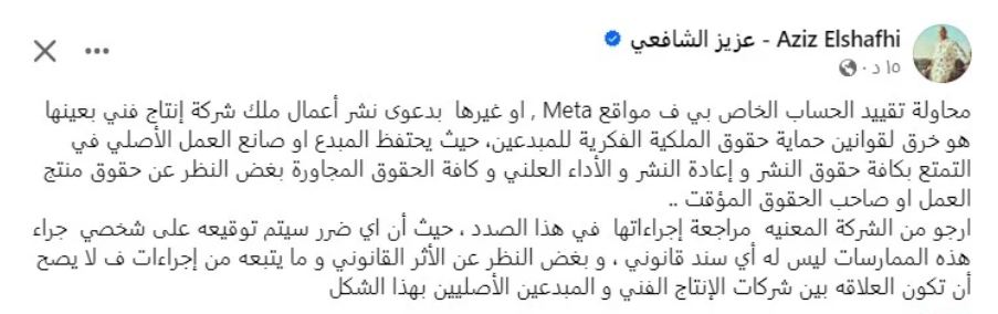 تابع «الشافعي» خلال منشوره: “ أرجو من الشركة المعنية مراجعة إجراءات ها في هذا الصدد، حيث إن أي ضرر سيتم توقيعه على شخصي جراء هذه الممارسات ليس له أي سند قانوني، وبغض النظر عن الأثر القانوني وما يتبعه من إجراءات في لا يصح أن تكون العلاقة بين شركات الإنتاج الفني والمبدعين الأصليين بهذا الشكل".
