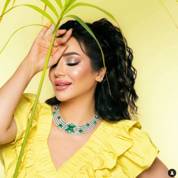 وأكملت رقي إطلالتها بعقد مصممت من حبات الألماس مع أحجار الزمرد الثمينة.