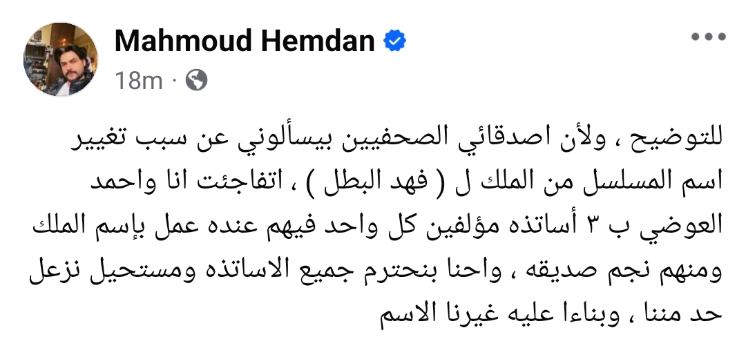 وكتب حمدان، عبر صفحته قائلًا : "للتوضيح ، ولأن اصدقائي الصحفيين بيسألوني عن سبب تغيير اسم المسلسل من الملك ل (فهد البطل)، اتفاجئت انا واحمد العوضي ب ٣ أساتذه مؤلفين كل واحد فيهم عنده عمل بإسم الملك ومنهم نجم صديقه، واحنا بنحترم جميع الاساتذه ومستحيل نزعل حد مننا، وبناء عليه غيرنا الاسم.