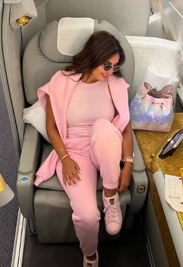 وظهرت شذى حسون بإطلالة كاجوال، تتناسب مع اجواء السفر، حيث أرتدت ترينج رياضي باللون البينك الفاتح، فيما انتعلت حذاء رياضي مسطح.