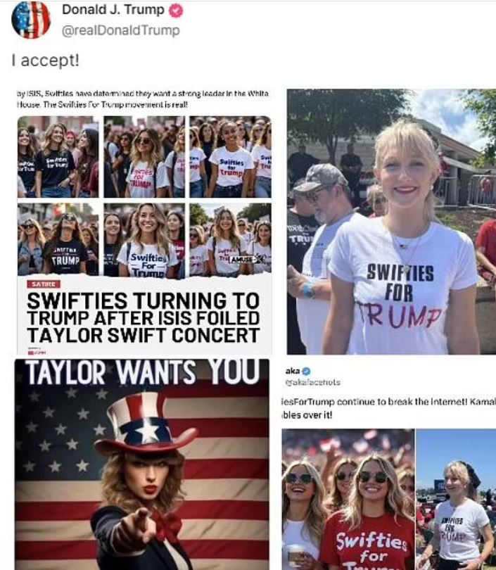 وكتب ترامب "أوافق" إلى جانب صور معدلة فيها مجموعة من النساء يرتدين قمصانًا مزينة بـ "Swifties For Trump"، بالإضافة إلى ملصق للمغنية مرتدية زي العم سام وتحث معجبيها على التصويت للمرشح الجمهوري.