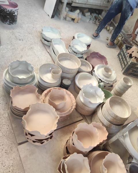 عن جنب، ترتكز مايبدو كخزانة ضخمة تقوم على ركائز من الصلب يحكم غلق بابها مفاتيح ضخمة، دقائق وتنطلق صافرة معلنة انتهاء مرحلة "الحرق"، يعمل أحد الشباب يده على فتح مقابض الفرن ينفتح الباب عن حمو كاللهب يلفح الوجوه، يتناوب العمال على حمل القطع من داخل، الفرن البسكوت، كما يطلقون عليه إلى صيجان تتراص على الجانبين، فيما يباشر فريق آخر على متابعة الخطوات التالية من خط الإنتاج، درجة بعد درجة في عملية شاقة تستغرق 10 إلى 20 يوم لإتمامها وصولاً إلى مرحلة الجليز، أي التلوين والرش.
