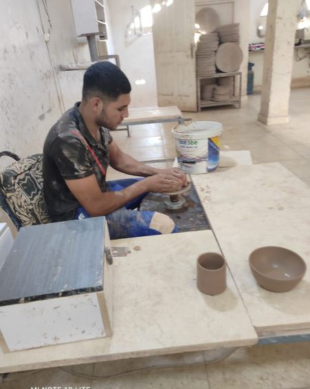 وعلى اسطوانة دائرية تتحرك بحرية حول محورها، يقبع كوب الخزف في انتظار الحصول على وجه لامع مصقول ومزيج من ألوان شتى تعيظ بهجة الحياة من جديد إلى الحمأ المطفي، كاللفيف يتراقص الكوب حول نفسه فيما يلبسه محمد تنورة من أبهى الألوان.