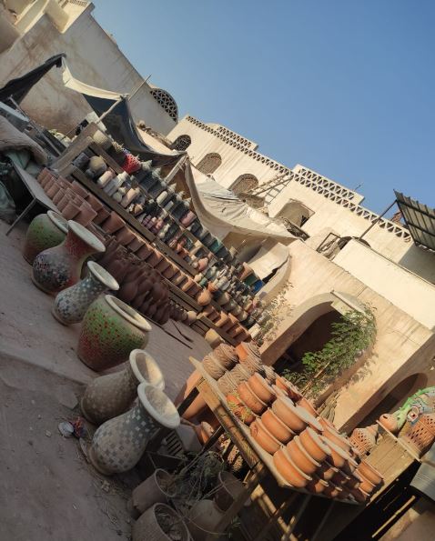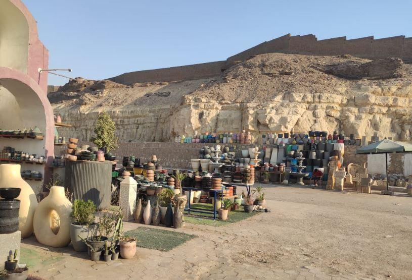 بوجه خضيته شمس المحروسة، وقسمات شق بينها الزمن خطوط الحنكة والرزانة، ومسحة من ملاحة بائدة لاتخطئها العين، يستقبلك علي درويش، الشهير بالحاج علي دقدق، رئيس مجلس إدارة القرية بجلبابه الصعيد البسيط يرافقنا في جولة بين فواخير القرية ليودعنا بين يدي عم إبراهيم صابر، على مدخل فاخورة صابر ومكمنه الخاص لصناعة الخزف، تطالعك أصيصات الزرع الخاوية جنبا إلى جنب مع أواني الطعام وغازات الزهور الموشاة بأجمل الزخارف والألوان بينما يرتفع جبل المقطم من خلفك كالوالي يشرف على سير العمر بالقرية من علياؤه، تصفعك رائحة غبار الطين الأسواني والبوكلا بينما تلح إلى ممر ضيق ترتفع على جانبيه ارفف الأواني الفخارية بلون الطين اللازب.