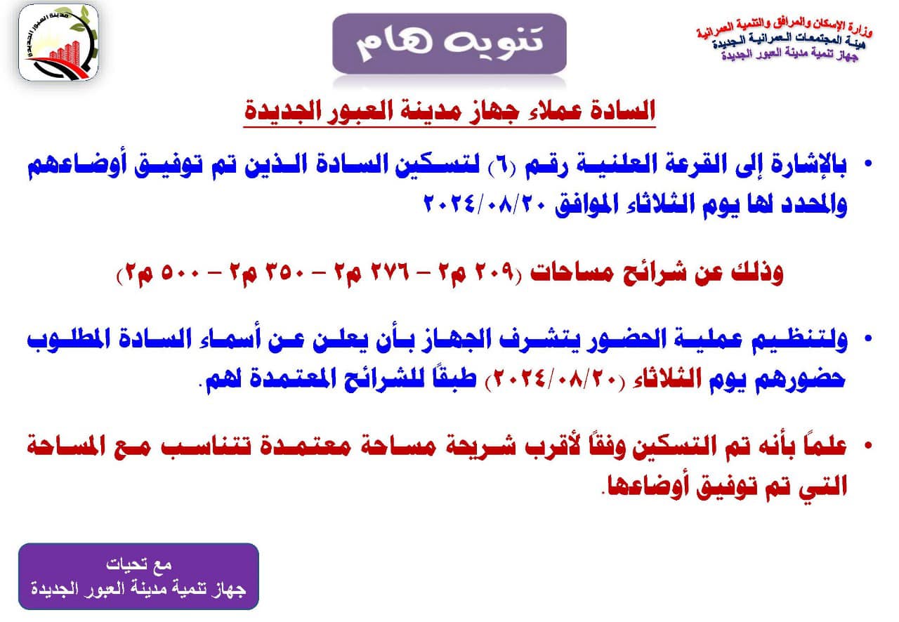 أعلن الدكتور مهندس أحمد إسماعيل، رئيس جهاز تنمية مدينة العبور الجديدة، عن إجراء اليوم، الثلاثاء الموافق 20/8/2024 القرعة العلنية اليدوية السادسة لتسكين المواطنين الذين قاموا بسداد المقدمات الخاصة بالمساحات التي تم توفيق أوضاعها لهم حتى يوم الخميس 18/7/2024م2، طبقاَ لشرائح المساحات (209م2 – 276م2 – 350م2 – 500م2) بمنطقة جمعية الأمل " سابقاً ".