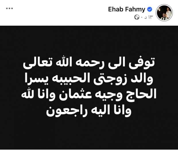 كشف النجم إيهاب فهمي عن موعد ومكان جنازة والد زوجته، وستُشيع الجنازة ظهر اليوم الثلاثاء، 20 أغسطس، من مسجد الشرطة بالشيخ زايد.