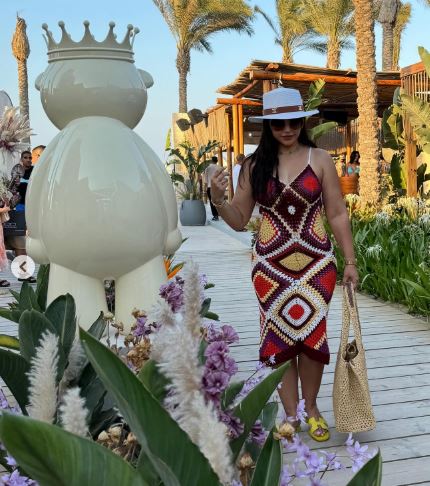 وفضلت ارتداء القبعة الخوص فوق خصلات شعرها مع نظارة الشمس التي تناغمت مع ملامحها الساحرة، كما نسقت حقيبة اليد من الخوص مع إطلالتها.