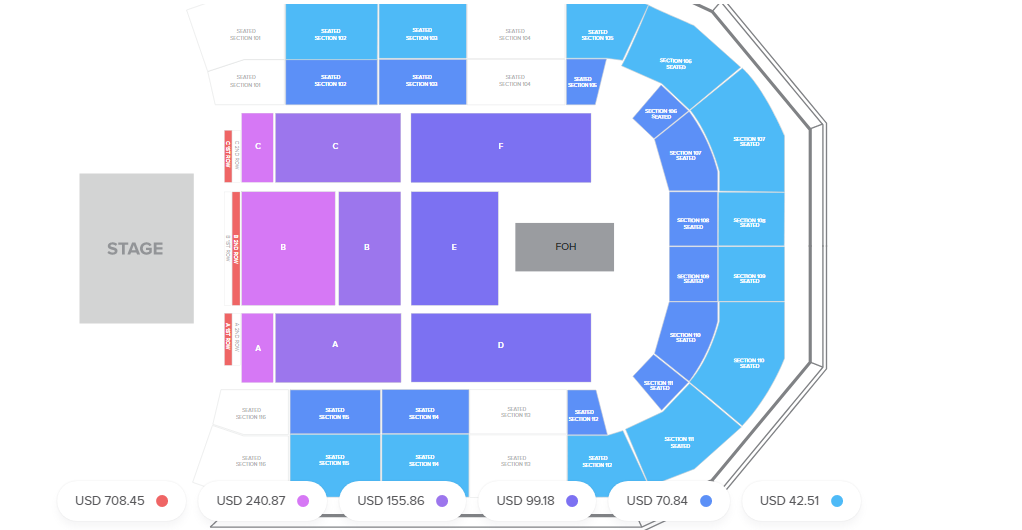 وقسمت أسعار التذاكر لـ 6 فئات وتراوحت بين  42 - 708 دولار، ويتم حجزها إلكترونيًا.