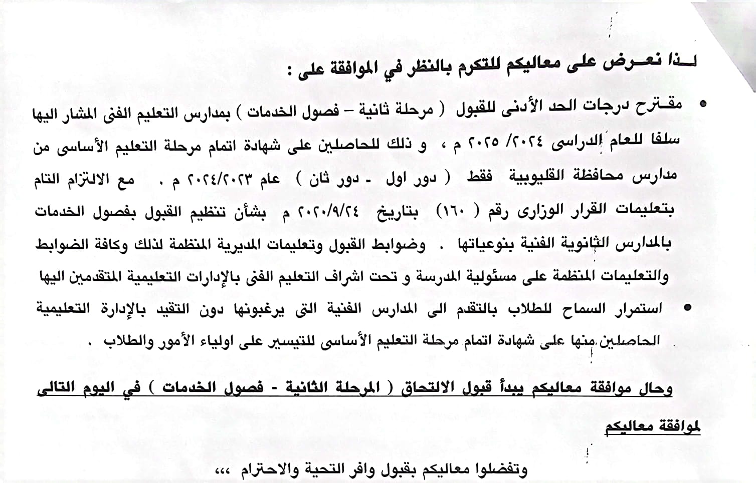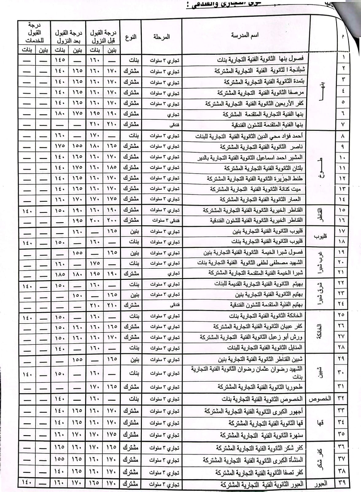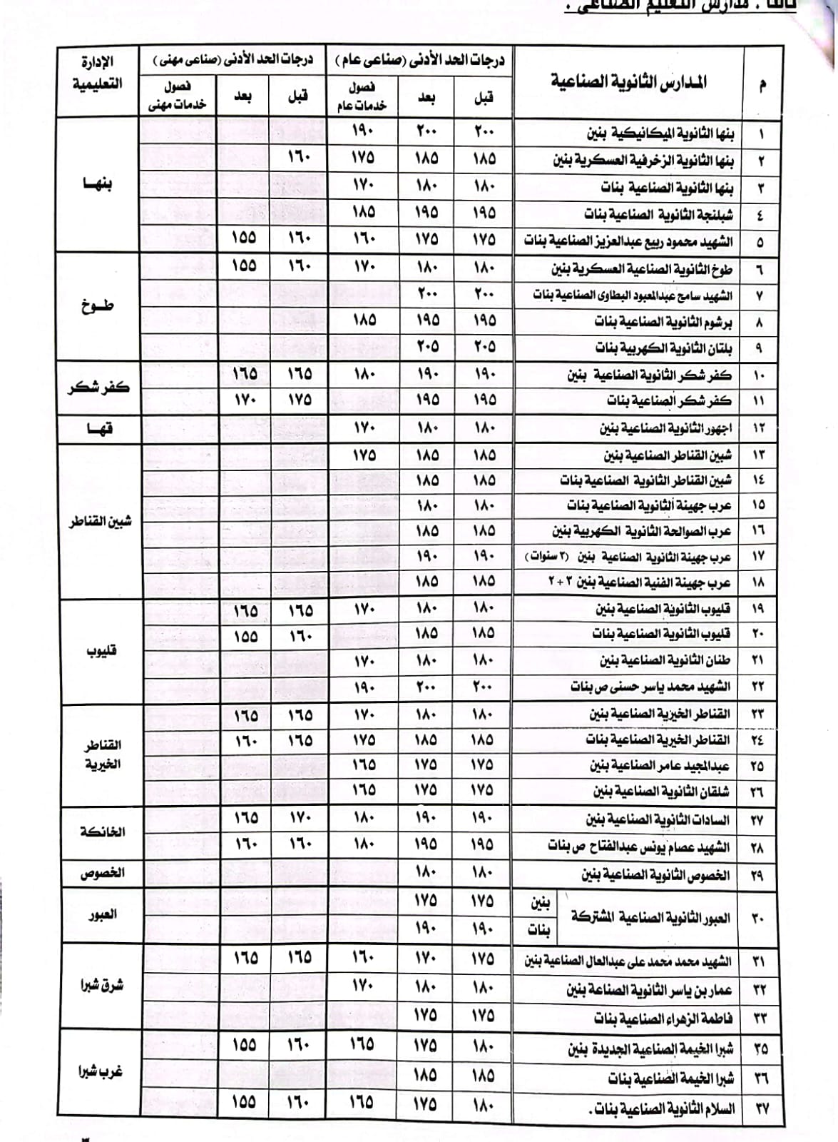 وافق المهندس ايمن عطيه محافظ القليوبية، على ما تم عرضه من مديرة مديرية التربية والتعليم بالقليوبية بشأن تخفيض الحد الأدنى للقبول ببعض مدارس التعليم الفني بنوعياتها (صناعي- زراعي- تجاري-فندقي)، ويأتي ذلك لاستكمال بعض الأماكن المحدودة ببعض المدارس وكذلك فتح فصول خدمات للمرحلة الثانية بمدارس التعليم الفني، وذلك تيسيرا على اولياء الامور والطلاب وحرصا على مستقبلهم على ان يتم يستمر قبول الالتحاق بالمدارس الفنية وذلك وفق البيان المرفق: