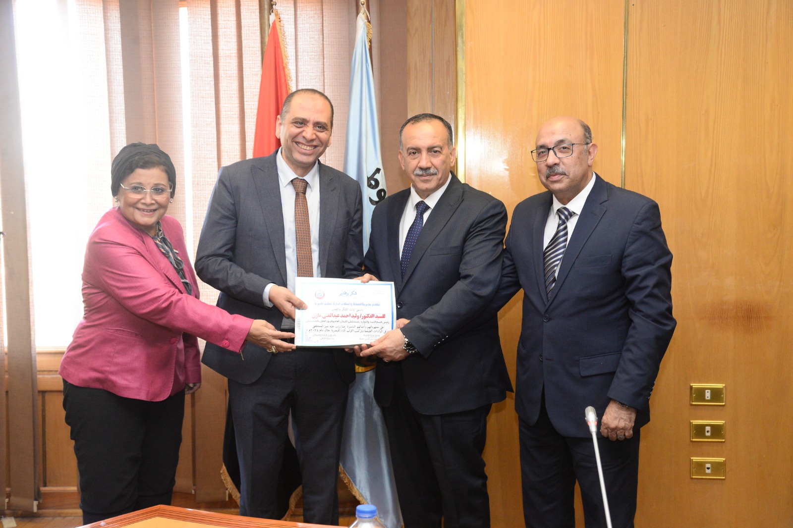 وفي نهاية الاجتماع تم تكريم الدكتور وليد مازن رئيس قسم النساء والتوليد بمستشفى الإيمان العام ، والدكتور رأفت عبد التواب رئيس القسم بمستشفى النساء والأطفال، وذلك تنفيذا لتكليف الأستاذ الدكتور خالد عبد الغفار نائب رئيس مجلس الوزراء ووزير الصحة، تقديرا لجهودهم في زيادة معدلات الولادة الطبيعية الآمنة، وخفض معدلات الولادة القيصرية غير المبررة، حيث بلغ معدل الولادات الطبيعية 59,7 % من إجمالي الولادات بمستشفى الإيمان العام ، و76,7 % بمستشفى النساء والأطفال.
