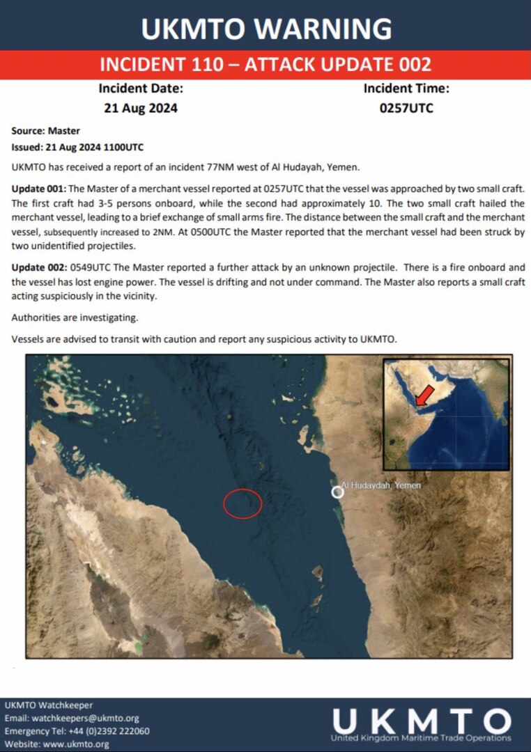 أعلنت هيئة عمليات التجارة البحرية البريطانية اندلاع حريق على متن سفينة تجارية إثر "هجوم استهدفها وكان الثالث من نوعه خلال ساعات" قبالة سواحل محافظة الحديدة غربي اليمن.
