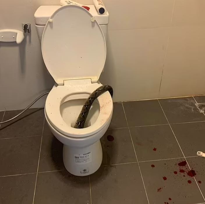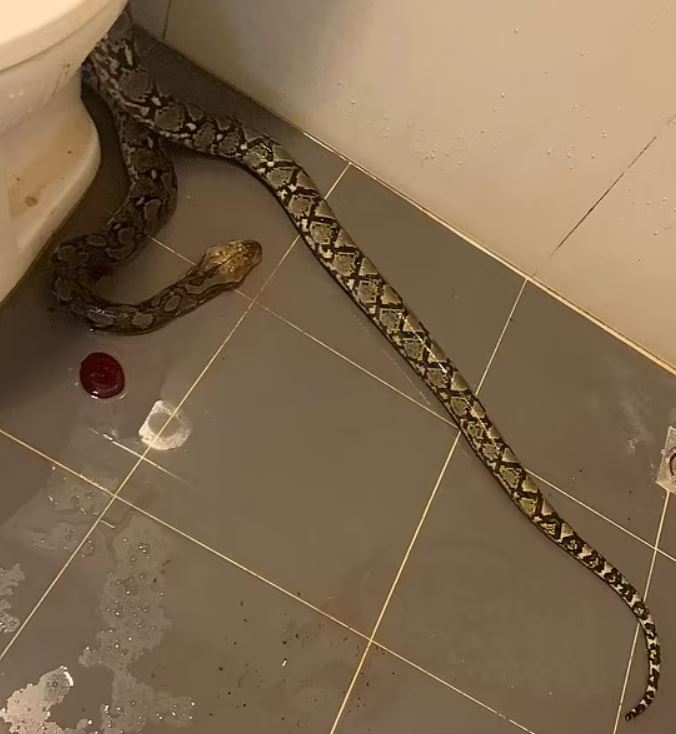 ونشرت صحيفة "ديلي ميل" البريطانية، صور مرعبة للثعبان الذي يبلغ طوله 12 قدمًا والذي كان يختبئ داخل المواسير وخرج من مرحاض منزل  ثانات تانجتيوانون أمس الثلاثاء.