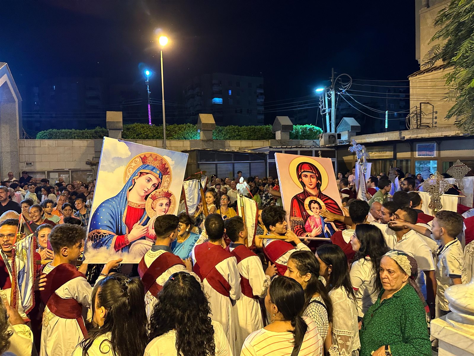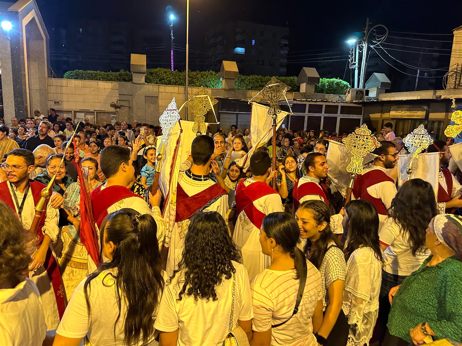 ووسط حالة من البهجة، انطلقت زفة الايقونات ابتهاجًا بعيد السيدة العذراء، واطلقت النساء الزغاريد، وتسابق الاطفال والفتيات للمس الايقونات، وسط احتشاد المئات من مسيحيي المحافظة.