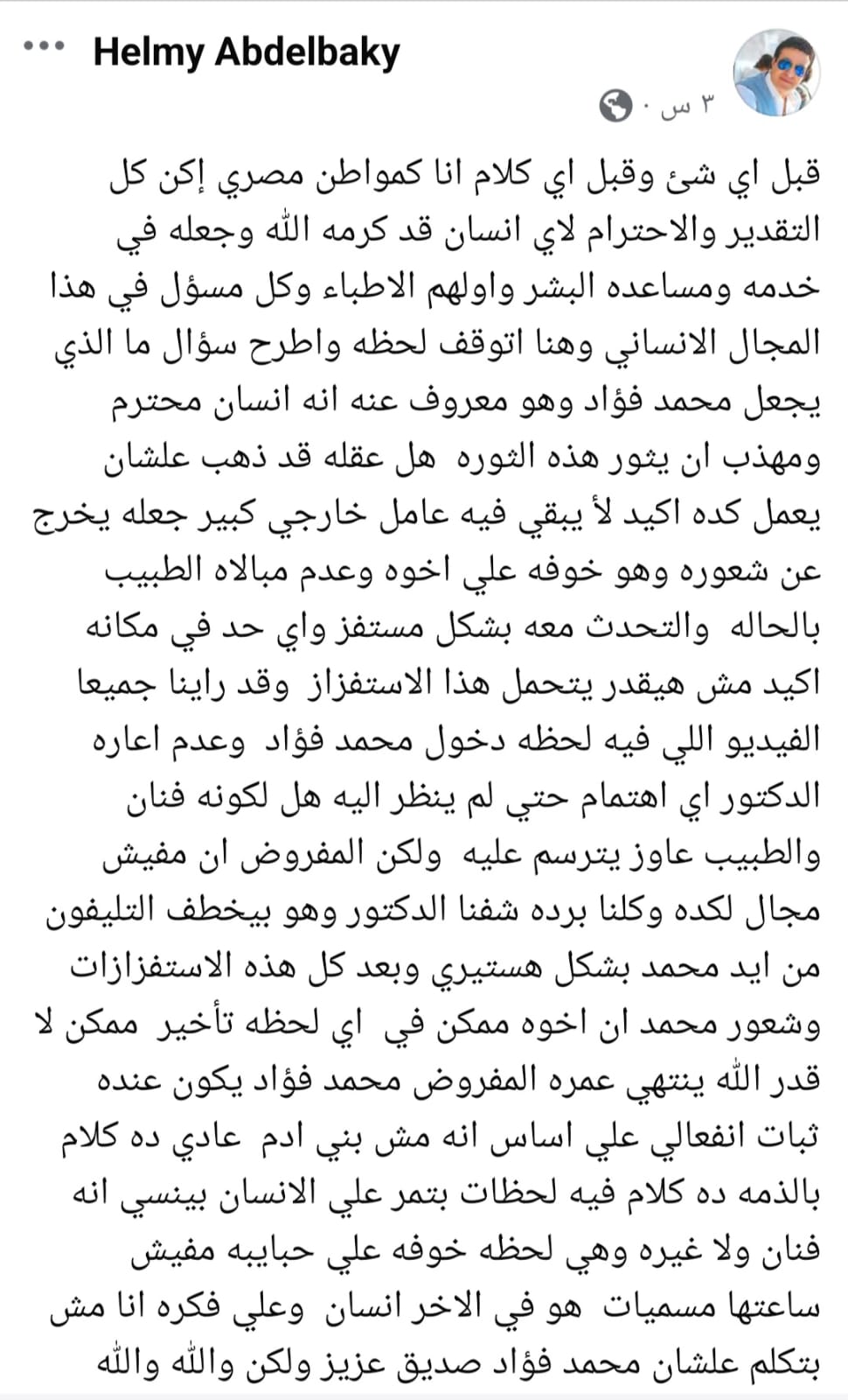 وأضاف وقد راينا جميعا الفيديو اللي فيه لحظه دخول محمد فؤاد  وعدم إهتمام الدكتور به، حتى لم ينظر اليه هل لكونه فنان  والطبيب عاوز يترسم عليه،  ولكن المفروض أن مفيش مجال لكده وكلنا برده شفنا الدكتور وهو بيخطف التليفون من إيد محمد بشكل هستيري وبعد كل هذه الاستفزازات، وشعور محمد ان أخوه ممكن في أي لحظة تأخير  ممكن لا قدر الله ينتهي عمره المفروض محمد فؤاد يكون عنده ثبات انفعالي علي اساس انه مش بني ادم  عادي ده كلام بالذمه ده كلام فيه لحظات بتمر علي الانسان بينسي أنه فنان ولا غيره وهي لحظه خوفه علي حبايبه مفيش ساعتها مسميات .