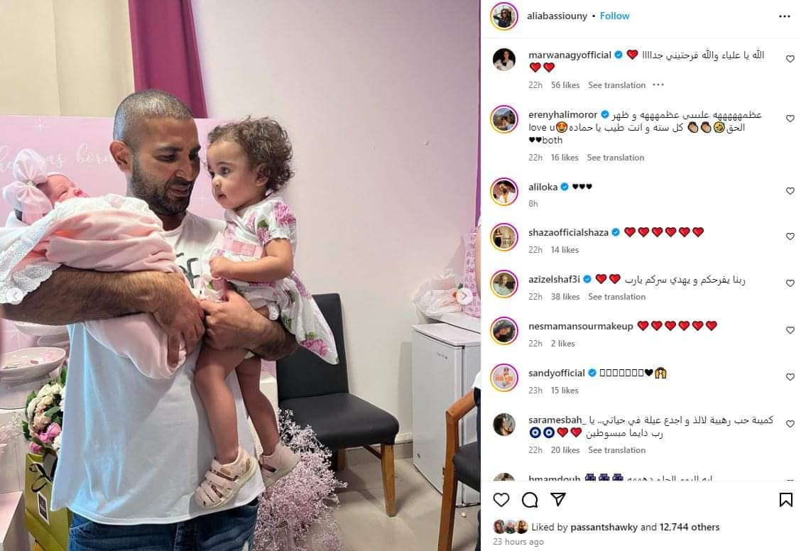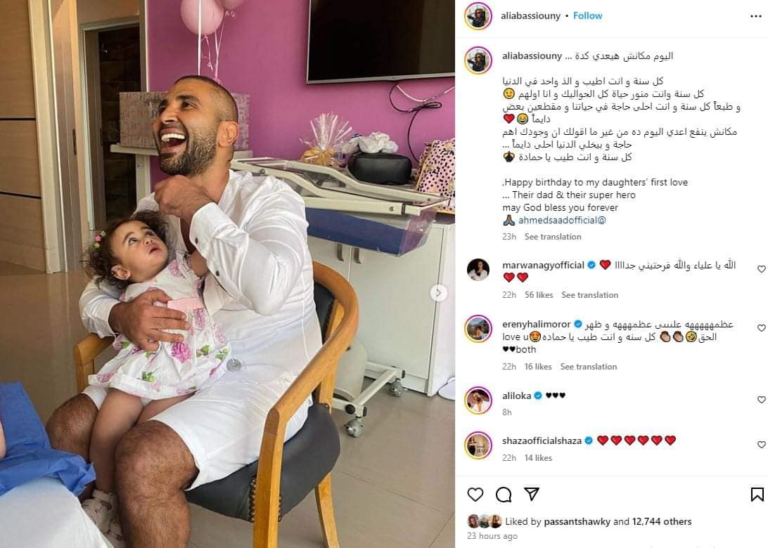 نشرت علياء بسيوني مجموعة صورة للفنان أحمد سعد وهو يحمل ابنتيه وأرفقتها برسالة حب دافئة قائلة: "اليوم مكانش هيعدي كدة .. كل سنة و انت اطيب و الذ واحد في الدنيا ... كل سنة وانت منور حياة كل الحواليك و انا اولهم .. و طبعاً كل سنة و انت احلى حاجة في حياتنا و مقطعين بعض دايمًا".