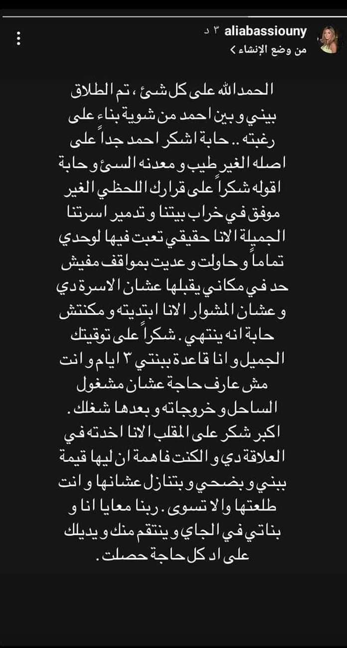 وكتبت علياء بسيوني: "الحمد لله على كل شيء تم الطلاق بيني وبين أحمد من شوية بناء على رغبته، حابة أشكر أحمد جدًا على أصله غير الطيب ومعدنه السيء وأحب أقوله شكرًا على قرارك اللحظي غير الموفق في خراب بيتنا وتدمير أسرتنا الجميلة اللي أنا حقيقي تعبت فيها لوحدي تمامًا وحاولت وعديت بمواقف مفيش حد في مكاني يقبلها عشان الأسرة دي وعشان المشوار اللي أنا ابتديته ومكنتش حابة إنه ينتهي".