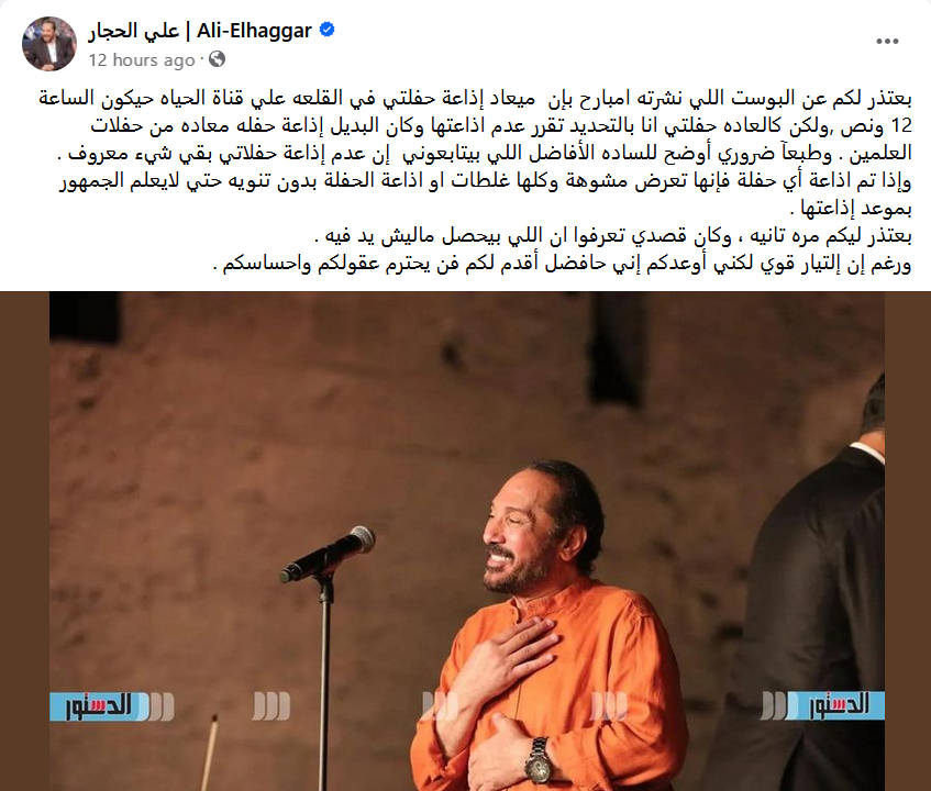 حالة من الاستياء والاعتراض عبّر عنها الفنان الكبير علي الحجار بعد عدم إذاعة حفله الجديد في مهرجان القلعة 32، وذلك عبر صفحته الرسمية على موقع التواصل الاجتماعي الشهير “فيسبوك”.