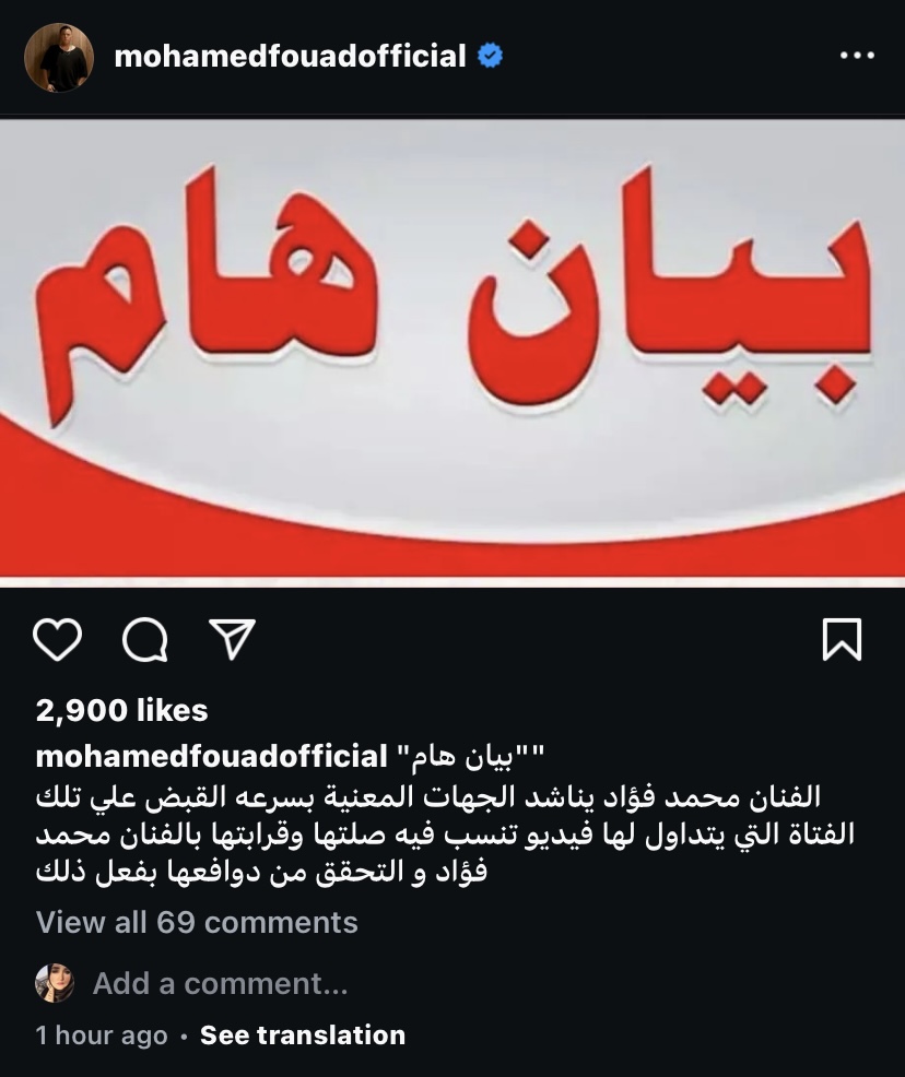 نشر محمد فؤاد البيان عبر حسابه الشخصي بموقع تبادل الصور والفيديوهات "انستجرام"، والذي جاء كالآتي: "بيان هام .. الفنان محمد فؤاد يناشد الجهات المعنية بسرعة القبض على تلك الفتاة التي يتداول لها فيديو تنسب فيه صلتها وقرابتها بالفنان محمد فؤاد".