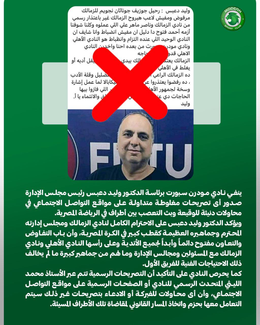ينفي نادي مودرن سبورت برئاسة الدكتور وليد دعبس رئيس مجلس الإدارة صدور أى تصريحات مغلوطة متداولة على مواقع التواصل الإجتماعي في محاولات دنيئة للوقيعة وبث التعصب بين أطراف في الرياضة المصرية.