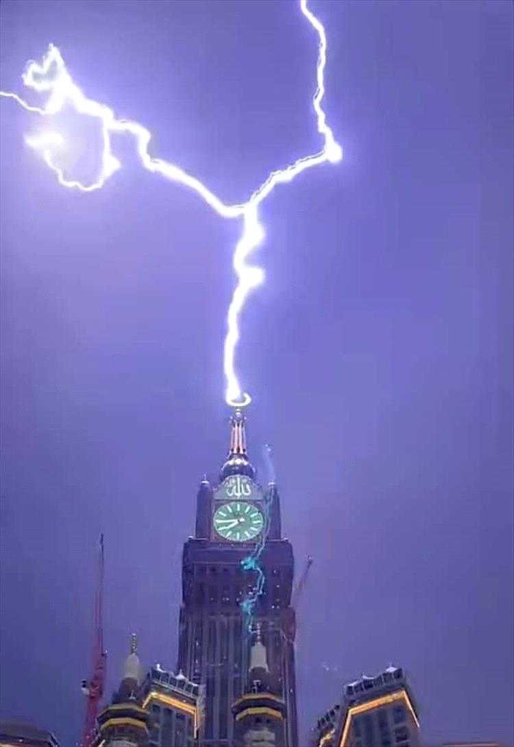 نشرت الهيئة العامة للعناية بشؤون الحرمين بالمملكة العربية السعودية، مقاطع فيديو وصورًا عبر حسابها الرسمي على موقع "إكس" تويتر سابقًا يظهران البرق وهو يضرب أعلى قمة برج الساعة في مكة المكرمة، وذلك تزامنًا مع الأمطار التي هطلت على الحرم المكي والمعتمرين أمس.