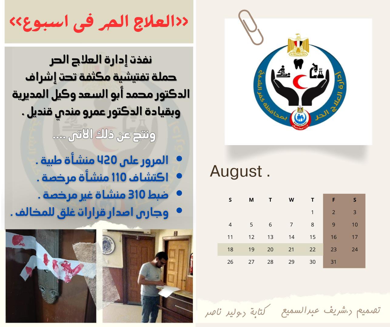 قامت إدارة العلاج الحر بمديرية الشئون الصحية بكفر الشيخ خلال الأسبوع الماضي بحملة تفتيشية مكثفة استهدفت المنشآت الطبية الخاصة في مختلف أنحاء المحافظة.