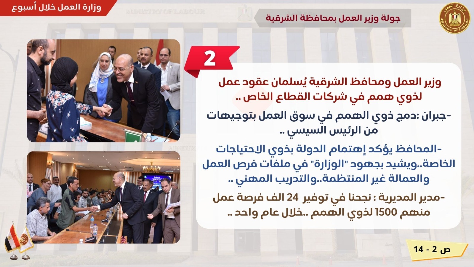 وناقش "الوزير"، و"المحافظ "، بحضور قيادات المحافظة و مدير مديرية عمل المحافظة أحمد عبدالهادي، ونواب برلمان، مجموعة من الملفات والتأكيد على تكثيف التعاون بشأنها منها توفير فرص العمل، ودمج ذوي الهمم في سوق العمل، حيث سَلّم وزير العمل ومحافظ الشرقية بمقر "المحافظة" 70 عقد عمل لذوي همم من أبناء "الشرقية"، وذلك في إطار تنفيذ توجيهات الرئيس عبدالفتاح السيسي بدمج ذوي الهمم في سوق العمل.