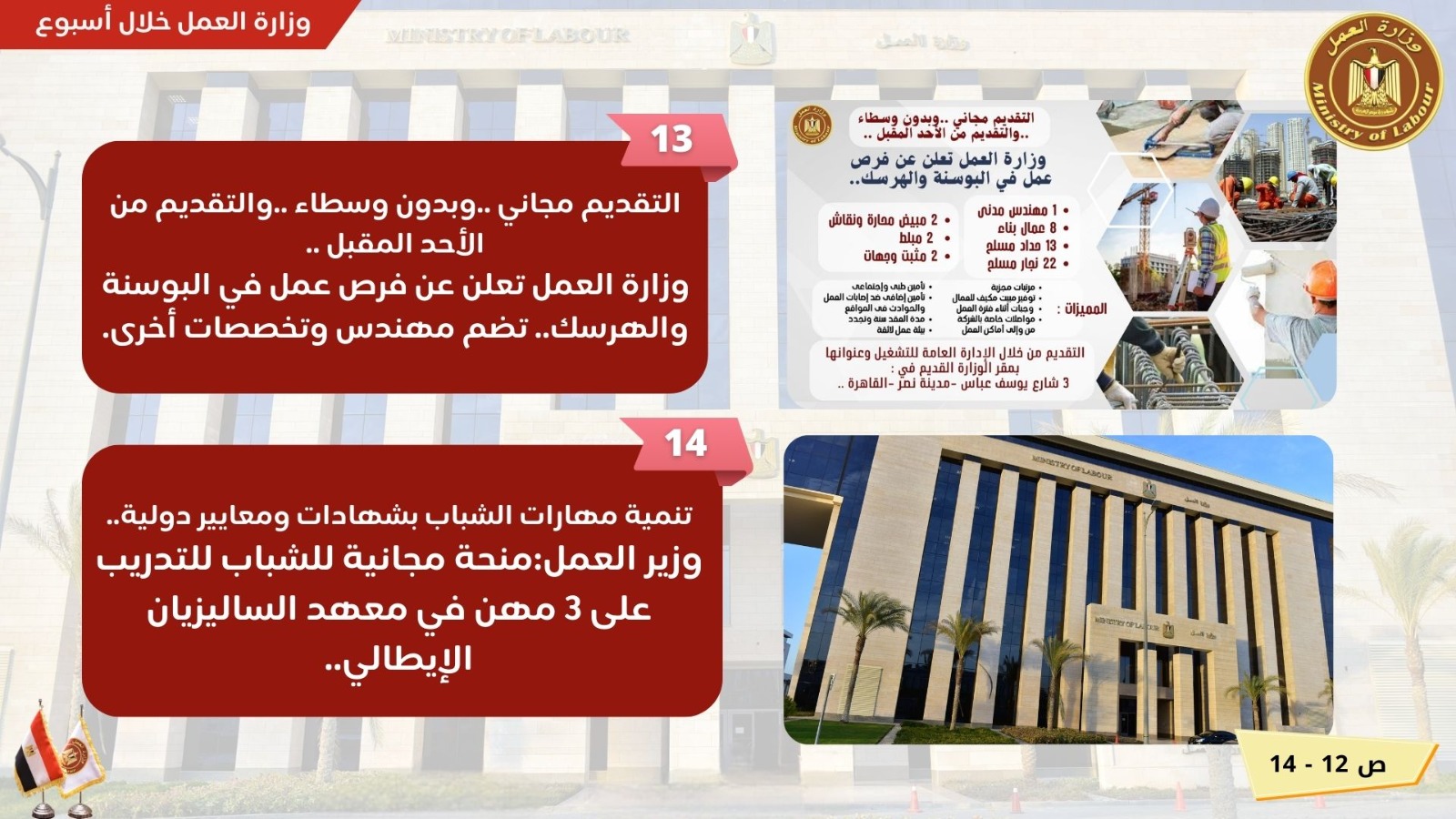 كما أعلنت الوزارة عن توفير فرص عمل للمصريين، بدولة البوسنة والهرسك، في التخصصات التالية : 1 مهندس مدنى ، و8 عمال بناء ، و 13 حداد مسلح ، و22 نجار مسلح ، و2 مبيض محارة ونقاش ، و 2 مبلط ، و2 مثبت وجهات ، وسيتم إجراء إختبار لتحديد مستوي المهارة على الحرف المطلوبة بديوان عام الوزارة.