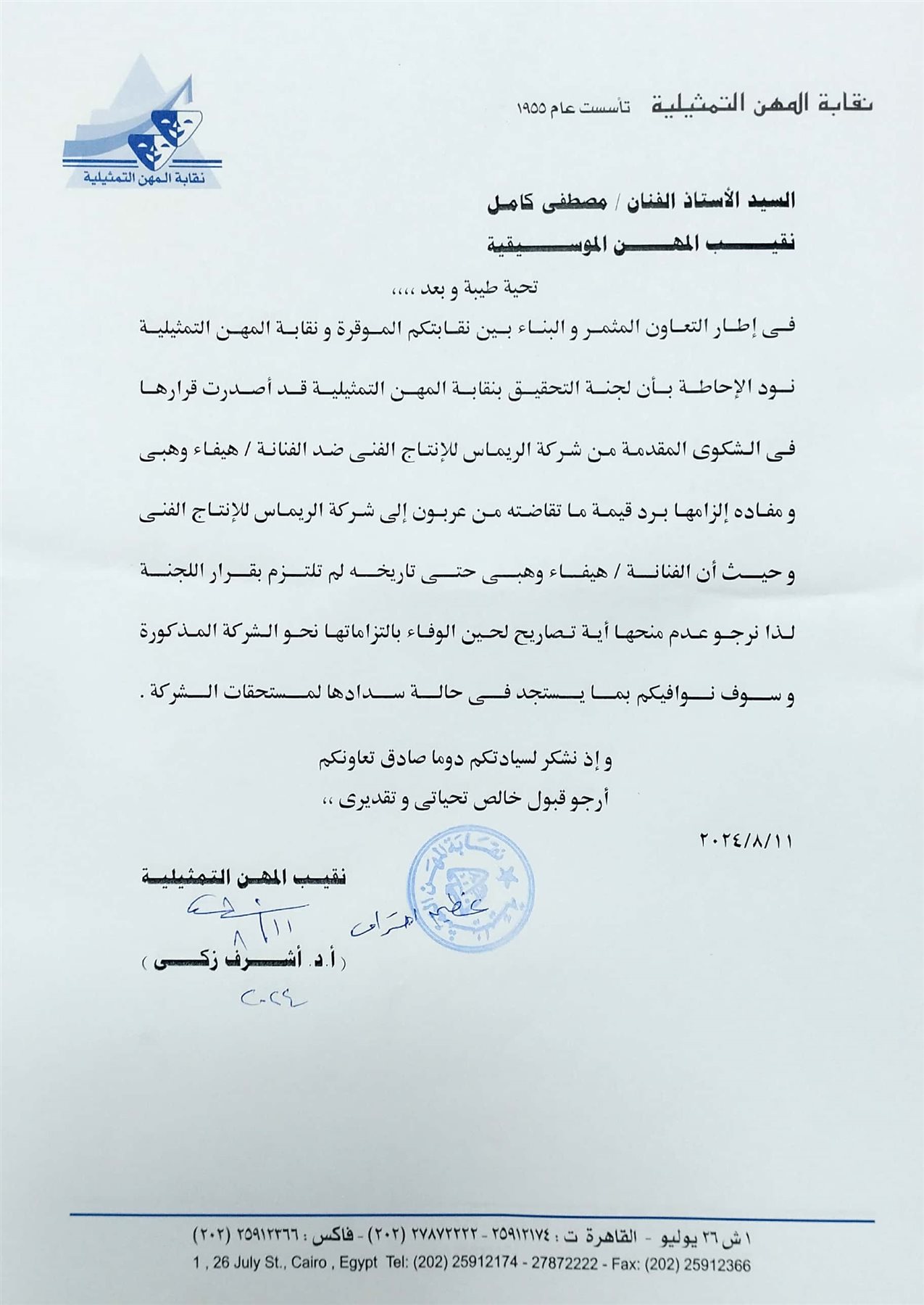 وكان قد خاطب الدكتور أشرف زكي نقيب المهن التمثيلية نظيره الفنان مصطفي كامل نقيب المهن الموسيقية بخطاب رسمي طالب فيه تفعيل دور اتحاد النقابات بضرورة التعاون المفروض قانونياً وأدبياً وإدارياً، حيث أخلت الفنانة هيفاء وهبي ببنود تعاقد فني بينها وبين شركة إنتاج سينمائي رغم حصولها علي عربون التعاقد ولم تنفذ ما جاء بقرار لجنة التحقيق بنقابة المهن التمثيلية والذي تلاه إيقافها عن العمل ومنع التصريح لها مجدداً .