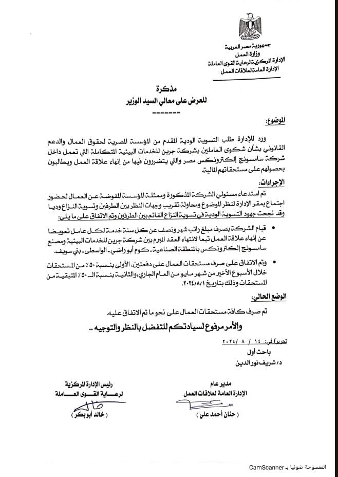 وبحسب معلومات الإدارة العامة لعلاقات العمل التابعة للإدارة المركزية لرعاية القوى العاملة، كان 68 عاملًا من شركة جرين للخدمات المتكاملة، تقدموا بمذكرة إلى مكتب العمل المختص بطلبات التسوية الودية، ثم جرى عقد اجتماع بمقر الوزارة بين ممثلي الإدارة والعمال، حيث نجحت جهود الإدارة المركزية لرعاية القوى العاملة، في تلك المفاوضة الجماعية، التي أسفرت عن صرف كل المستحقات.