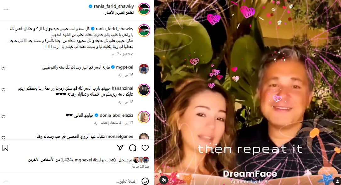 كتبت رانيا في تهنئتها: " سنة و انت حبيبي عيد جوازنا ال٩ وعقبال العمر كله يا راجل يا طيب يالي عمري معاك احلي من الشهد المدوب".