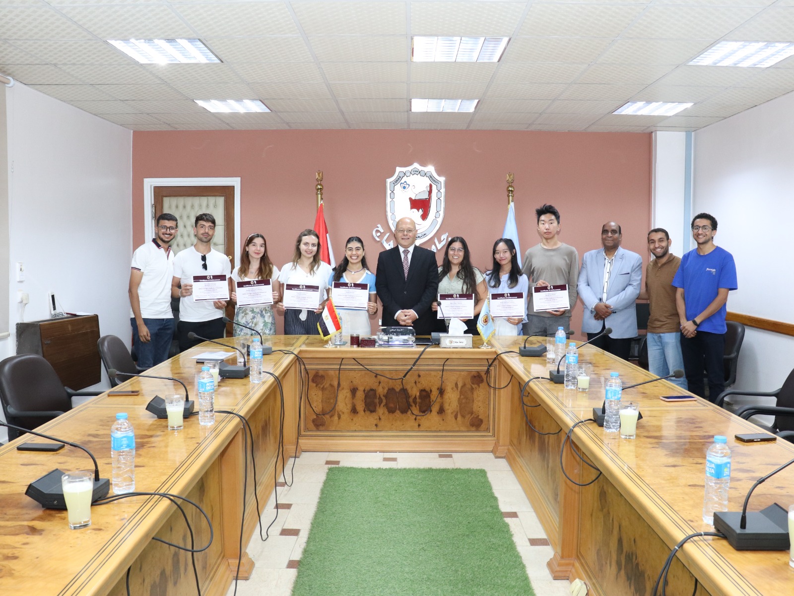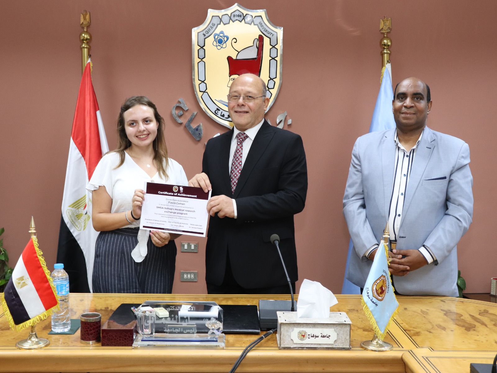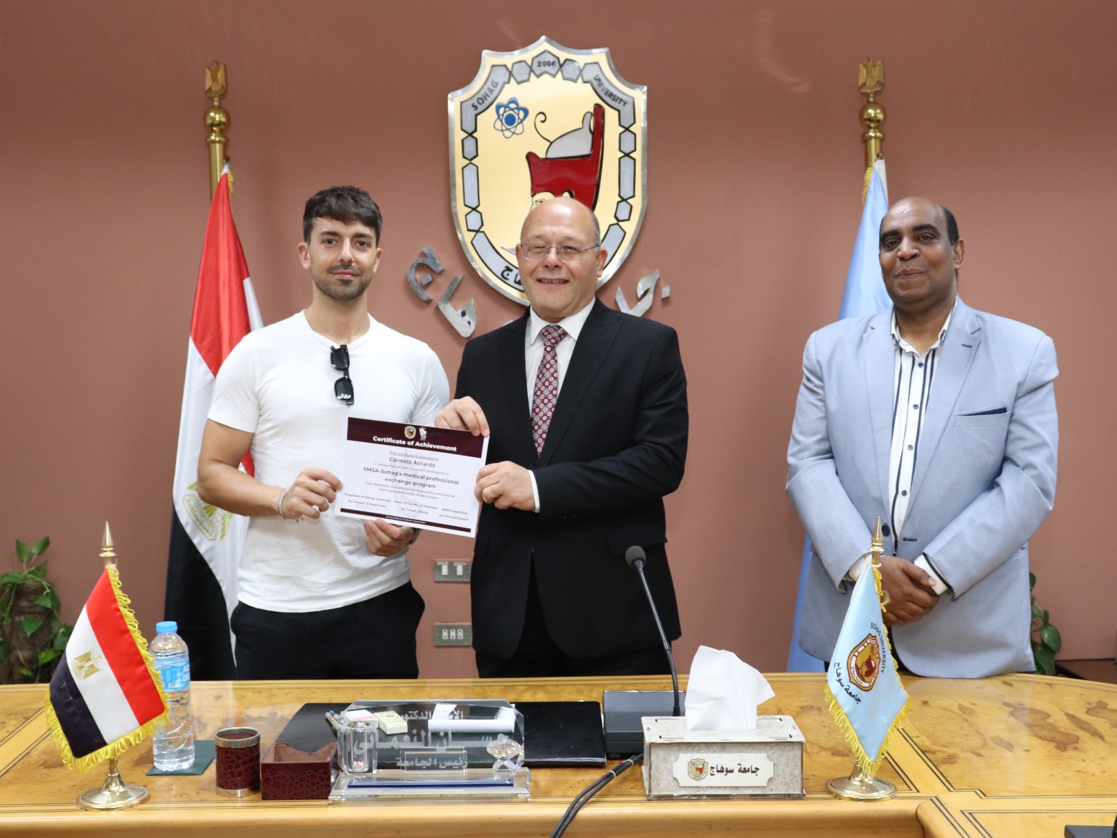 كرم الدكتور حسان النعماني رئيس جامعة سوهاج، وفدًا طلابياً من كليات الطب من دول «إسبانيا، إيطاليا، رومانيا، روسيا، المغرب و اندونيسيا»، عقب قضاء فترة تدريبهم بالأقسام الإكلينيكية بالمستشفيات الجامعية، وذلك ضمن برنامج التبادل الطلابي بالجامعة، والذي نظمته الجمعية العلمية الطلابية بكلية الطب SMSA.