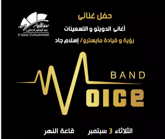 تستعد فرقة "فويس باند" رؤية وقيادة المايسترو إسلام جاد، تحيي حفلًا غنائيًا بقاعة النهر في ساقية عبدالمنعم الصاوي، يوم الثلاثاء 3 سبتمبر، في تمام الساعة الثامنة مساء، وسعر التذكرة 100جنيه.