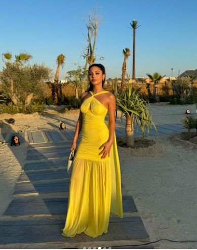 وجذبت مايان السيد، الأنظار، بفستان طويل ذي أكمام مكشوفة، واتسم التصميم باللون الأصفر المصنوع من القماش الشيفون الذي كشف عن أناقتها ورشاقتها.