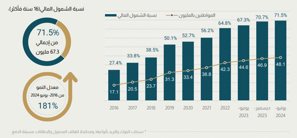 وارتفعت معدلات الشمول المالى فى مصر خلال الفترة من 2016 حتى يونيو 2024 بنسبة 181% ما يعكس زيادة استفادة المواطنين من الخدمات المالية، وتسهم المؤشرات الرئيسية للشمول المالى بشكل فعال فى متابعة تطور معدلات الشمول المالى ما يسهم فى وضع السياسات الداعمة لتحقيق التنمية المستدامة والتمكين الاقتصادى للمواطنين بما يتوافق مع رؤية مصر 2030.