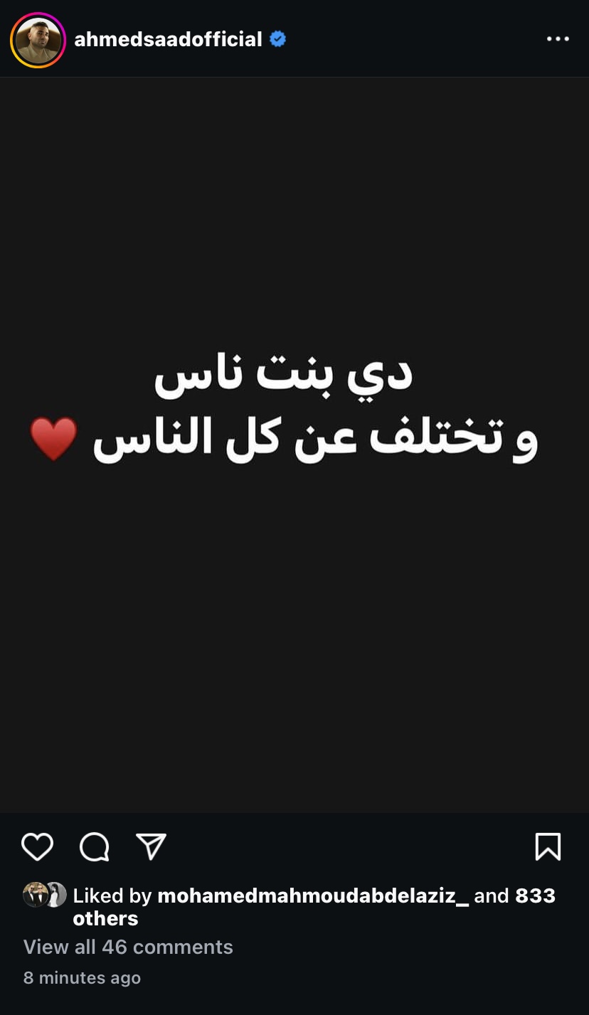 وكتب أحمد سعد: "دي بنت ناس وتختلف عن كل الناس"، وذلك خلال منشور عبر حسابه الرسمي بموقع تبادل الصور والفيديوهات "انستجرام".