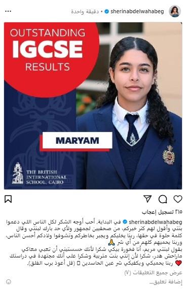 حرصت المطربة شيرين عبد الوهاب، على توجيه رسالة شكر وامتنان لابنتها مريم؛ بعد تفوقها الدراسي، وتواجدها ضمن أوائل المدرسة البريطانية التي تدرس فيها، معلقه:«شكرًا لأنك حسستيني إن تعبي معاكي ماراحش هدر».