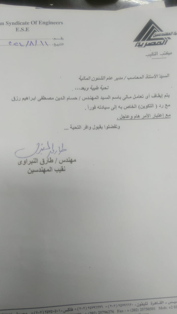 حصلت الوفد على صورة من خطاب موجهة من المهندس طارق النبراوي نقيب المهندسين إلى الإدارة المالية بالنقابة بوقف أي تعامل مالي باسم المهندس حسام الدين مصطفى إبراهيم رزق مع رد "التكوين" الخاص به الى سيادته فورا.