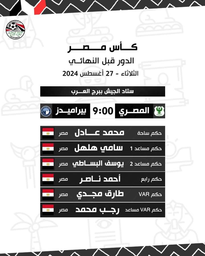 أعلنت اللجنة المنظمة بالاتحاد المصري لكرة القدم عن حكام مباراتي الثلاثاء في الدور قبل النهائي من كأس مصر.
